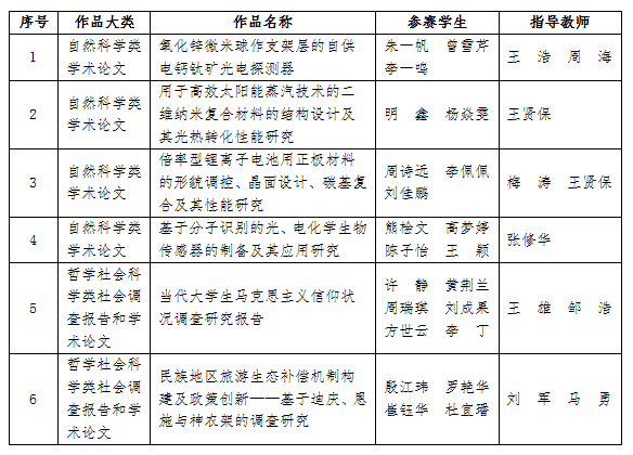 在湖北省第十二届“挑战杯”大学生课外学术科技作品竞赛中,beats365《氧化锌微米球作支架层的自供电钙钛矿光电探测器》、《用于高效太阳能蒸汽技术的二维纳米复合材料的结构设计及其光热转化性能研究》、《倍率型锂离子电池用正极材料的形貌调控、晶面设计、碳基复合及其性能研究》、《基于分子识别的光、电化学生物传感器的制备及其应用研究》四个项目获得一等奖,《当代大学生马克思主义信仰状况调查研究报告》、《民族地区旅游生态补偿机制构建及政策创新》两个项目获得二等奖,以上六个项目将代表beats365参加第十六届“挑战杯”全国大学生课外学术科技作品竞赛。