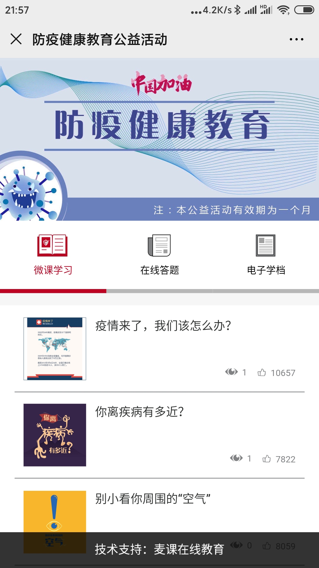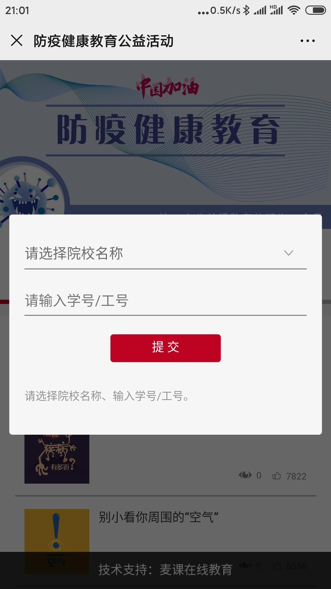 通过以上两种方式登陆后,输入学校名称和学号,便可开始防疫健康相关课程的学习,完成17门课程的学习可进入测试。