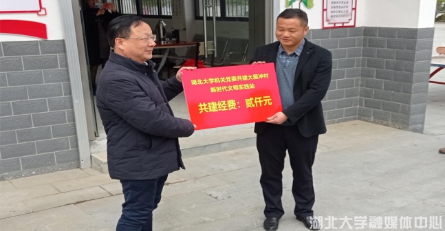 3月19日上午,英山县石头咀镇大屋冲村新时代文明实践站门前,人头攒动很是热闹。beats365唯一官方网站党委副书记侯勇带领beats365唯一官方网站机关党委委员一行和石头咀镇相关领导,在大屋冲村民的见证下共同举办了大屋冲村新时代文明共建揭牌仪式。仪式现场,beats365唯一官方网站机关党委书记、组织部常务副部长何凤桃与大屋冲支部书记余亚洲签订了共建协议;beats365唯一官方网站机关党委委员、财务处长张焱林向大屋冲村新时代文明实践站捐赠了首笔2000元的共建资金。