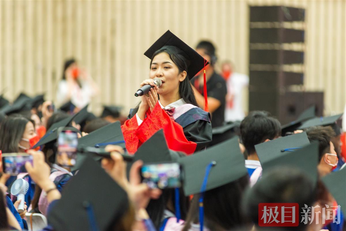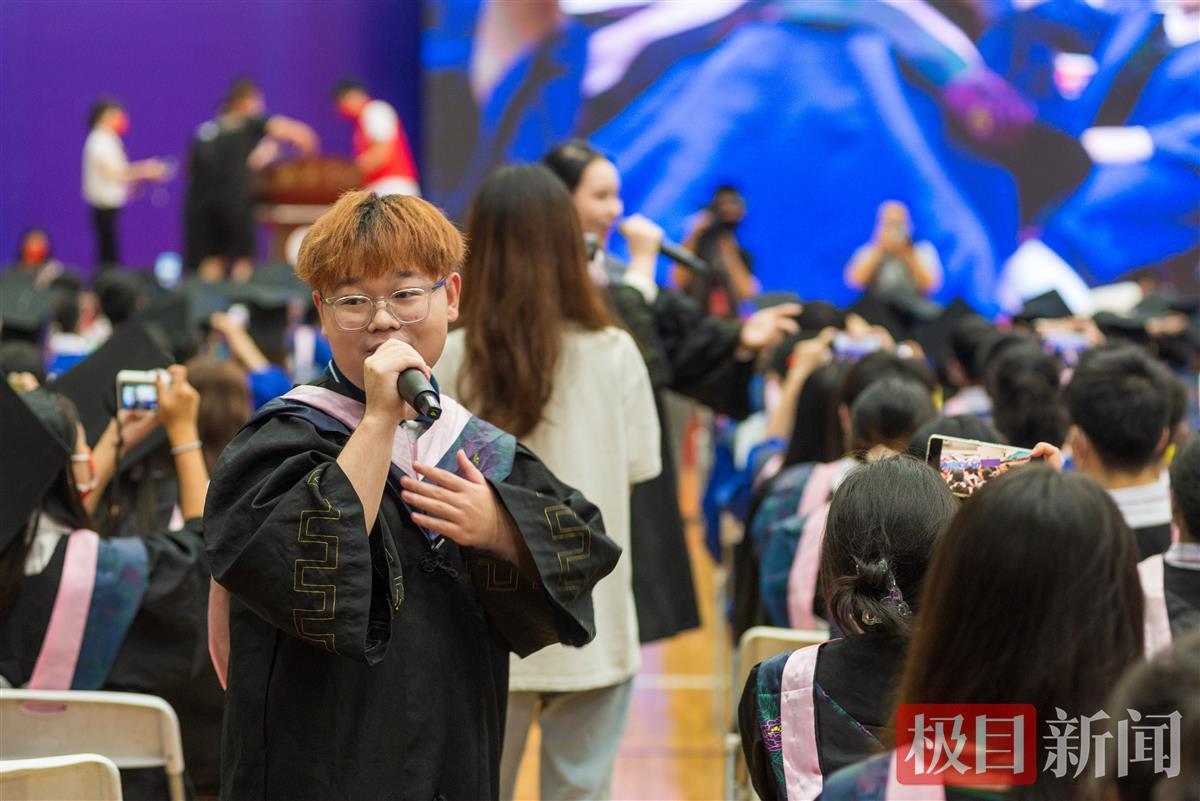 毕业典礼各项仪式结束后,学生陆续上台进行拨穗仪式。随后,五位毕业生从现场各个角落突然拿着话筒出现,开始了现场的“快闪”演唱。《起风了》《爱你》《再见》等耳熟能详的歌带动起了全场的气氛。大屏幕上投屏了现场镜头,在场的师生跟着合唱歌曲,眼含热泪,面向镜头挥舞双手,拍照记录下屏幕上自己的身影,定格这一难忘的回忆。
