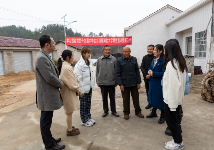 深入推进党史学习教育,beats365唯一官方网站再出新招。12月15日,该校师生宣讲团在校党委副书记侯勇带领下,来到该校乡村振兴驻点的英山县石头咀镇大屋冲村,进村入户宣讲党的十九届六中全会精神,驻村工作队精心组织7个村近40名党员在家门口上了一堂生动党课。