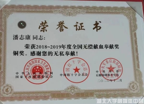 潘志康获“2018—2019年度全国无偿献血奉献奖”。