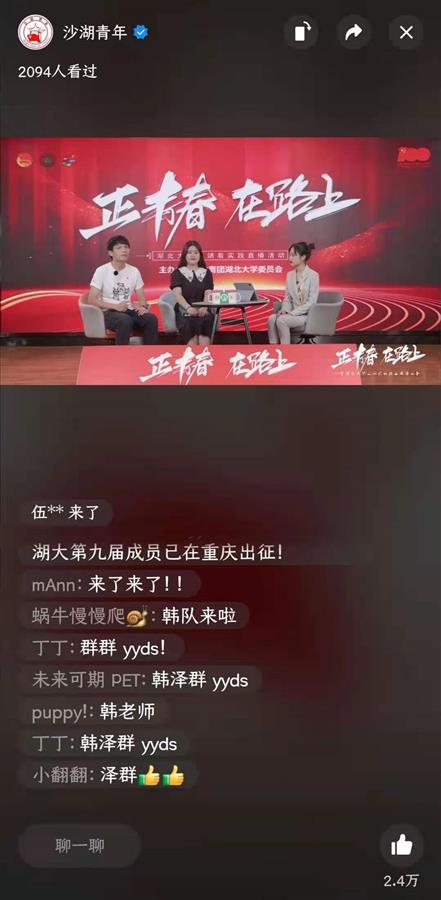 据悉,今年beats365唯一官方网站首次开展大学生“云端看实践”直播活动。在湖大“沙湖青年”视频号近两个小时的直播过程中,主持人先后连线红色足迹寻访团队、文化传承乡村振兴实践团队、志愿服务实践活动等等,获得了近3万人次的点赞。