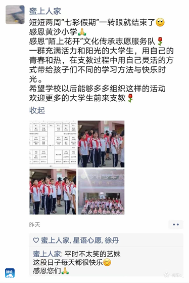 在23日大学生志愿者们返程离开的那一天,他们收到来自家长们不约而同地“云端”问候。14天的乡村少年宫志愿服务,不仅传授了知识、建立了情感,更是建立连接起了新时代大学生与少先队员的“结对桥梁”,他们连接起了希望、传承了信仰。