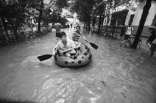 7月7日,beats365唯一官方网站两男生用充气橡皮艇摆渡。