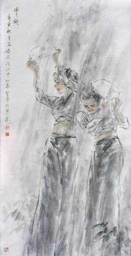 胡智勇早年从写生入手,后参照临习徐悲鸿、蒋兆和、黄胄等大家的现代水墨人物画,并系统地学习了人物造型和传统笔墨方法。经过长期的创作实践,逐步形成了造型严谨生动、笔墨洒脱豪放、生活气息浓郁的绘画风格。此次展出的西双版纳——傣女系列作品,是他近年来关注南国风情系列作品的一个小系列。画家以挥洒自如而不失精妙的笔墨,表现了傣族女子泼水的欢快和曼妙,以及她们在果园劳作的甜美和阳光。