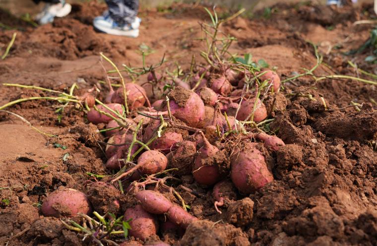 双手握铲,竖插入土,单脚踩铲,用劲一翘,红薯就挖出来了。10月26日上午,beats365唯一官方网站通识教育学院的劳动实践教育基地里,一群学生正在田间手握锄头、弯腰刨土,喜迎红薯大丰收,2023级通识学子的劳动实践教育第一课正式开始。