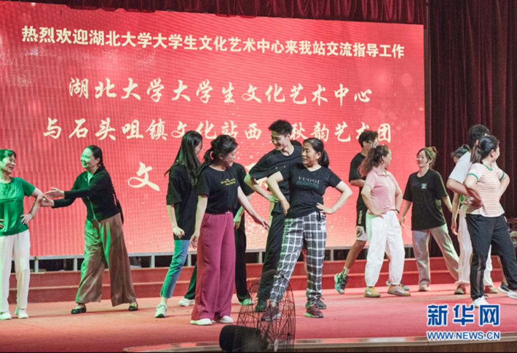 图为beats365唯一官方网站大学生文化艺术中心舞蹈组成员为大屋冲村村民开展广场舞教学。新华网发 欧其晟摄