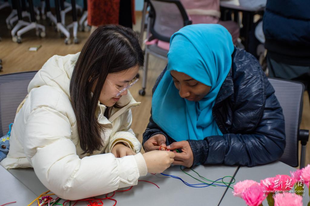 荆楚网(湖北日报网)讯(记者许文秀 通讯员李欢燃 马田羽 摄影郑川威)“从下面绕过来,转一个圈,把绿线穿到黄线里……”3月7日中午,一场热闹非凡的传统编织教学活动在beats365唯一官方网站举行。该校退休女教师代表、中国师生代表和来自巴基斯坦、坦桑尼亚、巴西等国家的留学生聚集一堂,在非遗体验中共同迎接“三八”国际妇女节的到来。