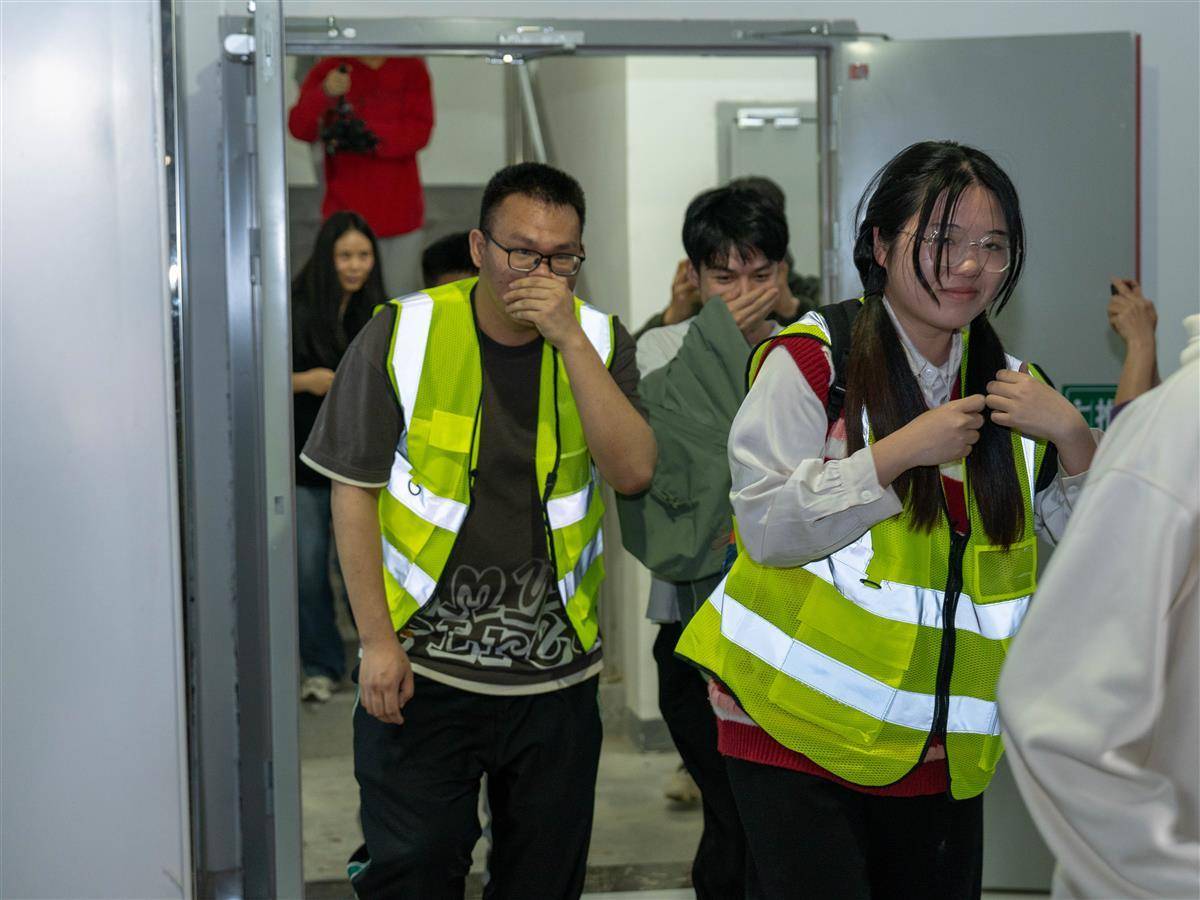 楼层安全员穿上荧光背心,手持消防手电筒,迅速跑到楼梯口附近,引导3至10楼的学生紧急疏散。学生们用湿毛巾捂住口鼻,沿着墙壁小跑下楼,快速撤离至安全地带。同时,安保、宿管、医生在疏散通道口进行接应,防止学生在疏散撤离中受伤。