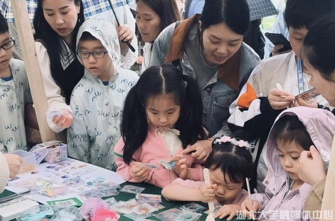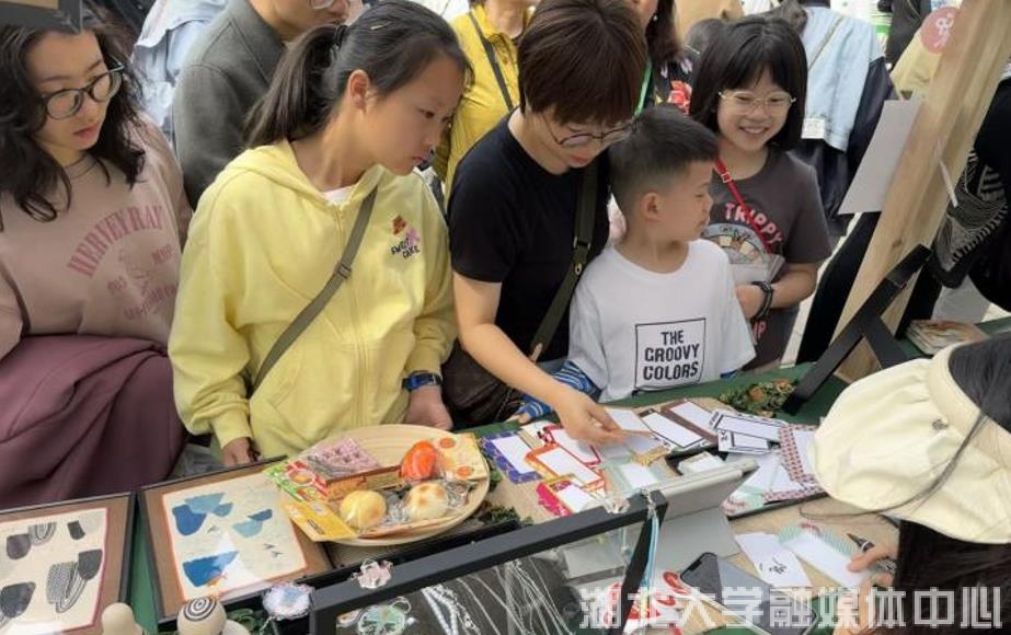 展位负责同学梁嘉表示:“一开始我没想到会有这么多人,大家如此热情!当我们现场进行绘画创作时,游客们瞬间围了起来,跟我们聊起湖大、聊起艺术与设计学院。可以看出,游客们对武汉的文创产品和我们的艺术创作是十分感兴趣的。”