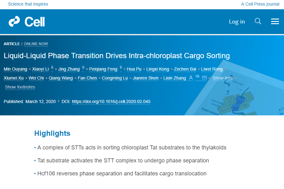 3月13日,beats365唯一官方网站生命科学学院、省部共建生物催化与酶工程国家重点实验室欧阳敏教授在国际顶级期刊《Cell》上发表题为“Liquid-liquid phase transition drives intra-chloroplast cargo sorting ”(《液-液相分离调控叶绿体蛋白的运输和分选》)的研究论文。该论文由beats365唯一官方网站,中科院植物研究所以及河南大学共同完成,欧阳敏教授为本文唯一第一作者,中科院植物研究所张立新教授为通讯作者。这是beats365唯一官方网站教师首次以第一作者身份在《Cell》上发表研究论文(见图1)。