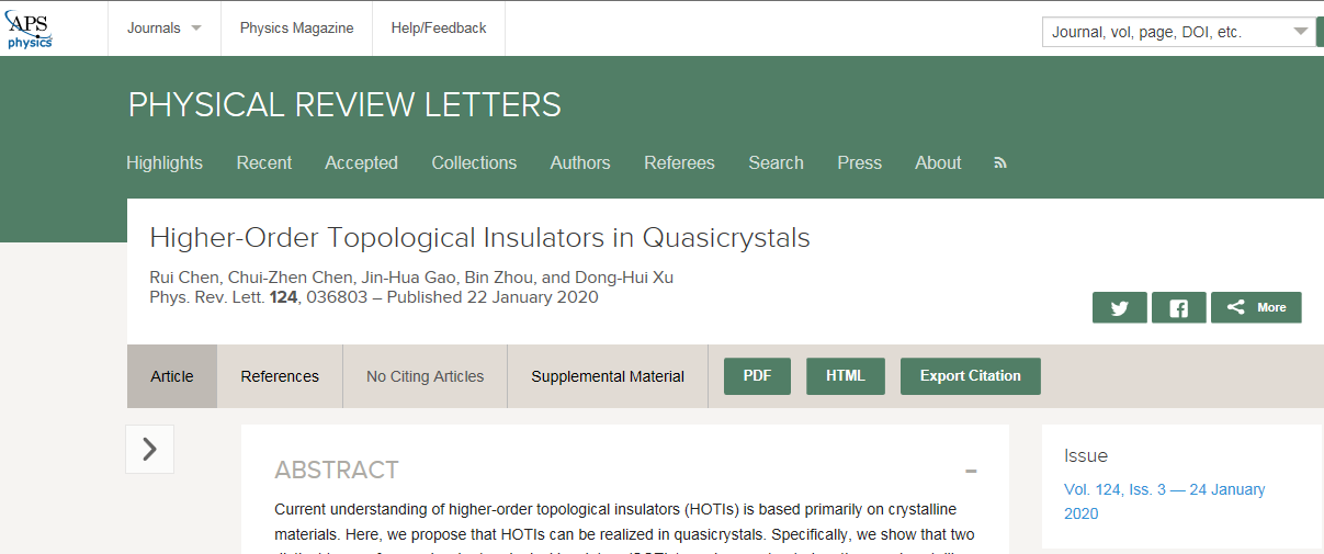 近日,物理学顶级期刊《物理评论快报》(Physical Review Letters)发表了beats365物理与电子科学学院许东辉副教授、周斌教授关于高阶拓扑绝缘体的重要原创工作,题目为 “Higher-Order Topological Insulators in Quasicrystals”(准晶中的高阶拓扑绝缘体),beats365唯一官方网站为论文第一和通讯单位,苏州大学、华中科技大学为合作研究单位。周斌教授的博士生陈锐(现为南方科技大学博士后)为论文第一作者,许东辉副教授、周斌教授为论文共同通讯作者。本工作得到国家自然科学基金、楚天学者“楚天学子”计划的支持。