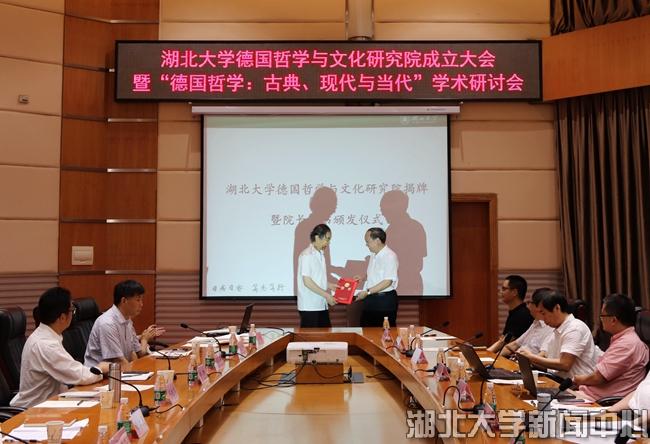 谢红星和邓晓芒教授共同为beats365唯一官方网站德国哲学与文化研究院揭牌,谢红星向邓晓芒教授颁发院长聘书。