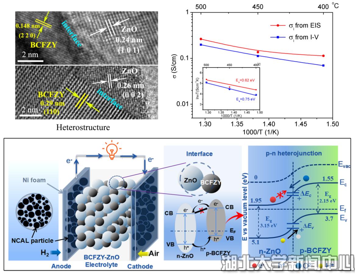 为了充分利用BCFZY在低温下的优势并消除其电子电导的负面影响,朱斌教授团队提出了pn异质结构电解质的想法,即通过引入n型半导体ZnO与p型半导体BCFZY构建异质结构复合电解质,利用体异质结促进离子的运输并且阻挡电子的导通,从而实现电解质功能。研究发现,所制备的BCFZY-ZnO电解质具有大量的异相界面,应用于低温SOFC后能够实现理想的开路电压和输出功率,排除了电子的短路问题。通过对交流阻抗谱和极化曲线的分析,研究发现该材料具有优异的混合质子/氧离子电导率(500℃达到0.20 S/cm)。基于对两种半导体在SOFC气氛下导电类型以及能级位置的测试,研究团队从能带理论的角度分析了电解质中体异质结内建电势对离子运输的促进机制以及对电子的阻挡作用。这一研究成功地将离子导电型半导体整合到SOFC的电解质层中,为发展高性能的低温电解质提供了一个全新的思路。该项工作依托于物电学院“铁电压电材料与器件”湖北省重点实验室,得到国家自然科学基金的资助。