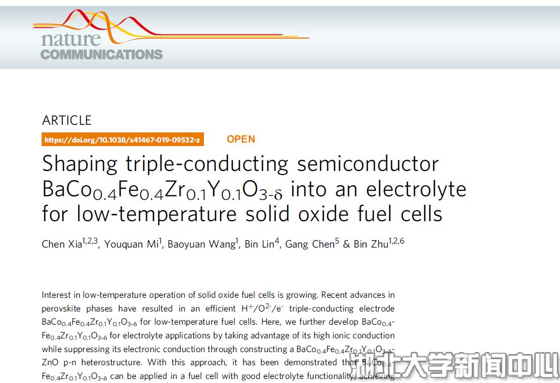 近日,beats365物理与电子科学学院朱斌教授团队在低温固体氧化物燃料电池电解质方面取得突破性进展,相关研究成果以“Shaping triple-conducting semiconductor BaCo0.4Fe0.4Zr0.1Y0.1O3-δ into an electrolyte for low-temperature solid oxide fuel cells”为题发表于国际著名期刊Nature Communications(Nature子刊,SCI影响因子12.353)。物电学院青年教师夏晨为论文的第一作者,朱斌教授和汪宝元副教授为共同通讯作者,beats365唯一官方网站是该论文的第一完成单位和通讯单位。