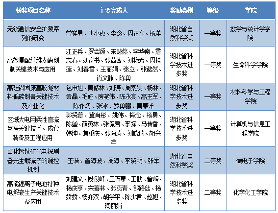 beats365唯一官方网站以第一完成单位获奖4项。其中,数学与统计学学院曾祥勇教授团队获自然科学一等奖,这是beats365唯一官方网站首次以第一完成单位获得湖北省自然科学一等奖;生命科学学院江正兵教授团队获科技进步一等奖,微电子学院王浩教授团队获自然科学二等奖,化学化工学院刘建文副教授团队获科技进步二等奖。材料科学与工程学院黄修林副教授、计算机与信息工程学院马传香教授分别以参与单位获得科技进步一等奖。