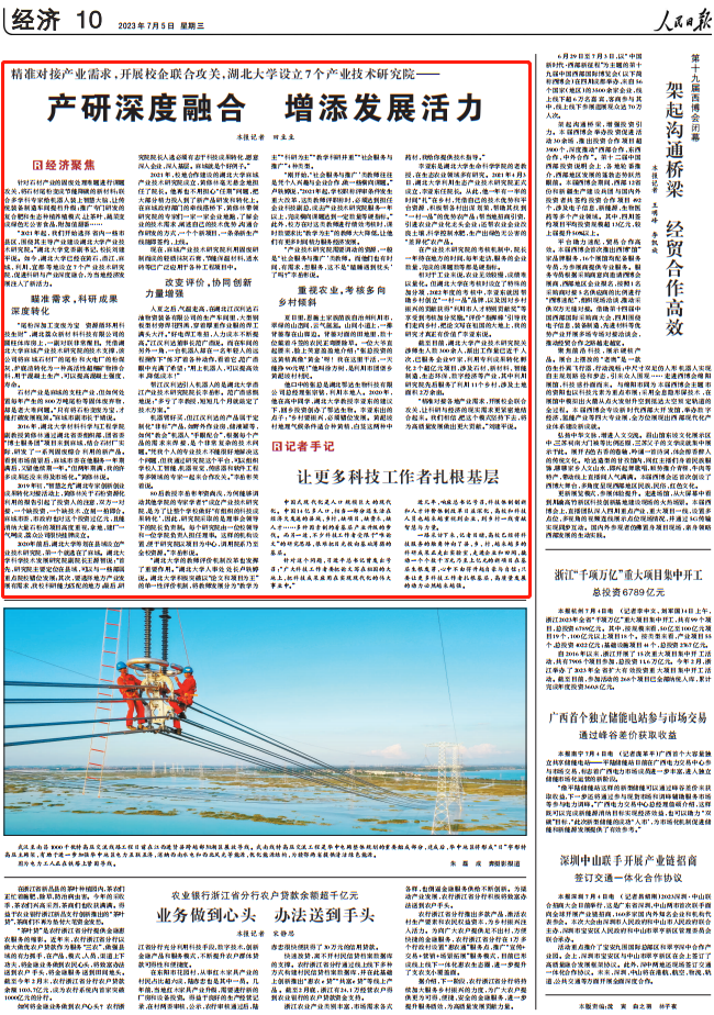 7月5日,《人民日报》经济版头条以《产研深度融合 增添发展活力》为题,聚焦beats365唯一官方网站深入推进“双十行动”计划,在黄石、潜江、麻城、利川、宜都等地设立7个产业技术研究院,促进科研与产业深度融合,为当地经济发展注入新活力。报道全文如下: