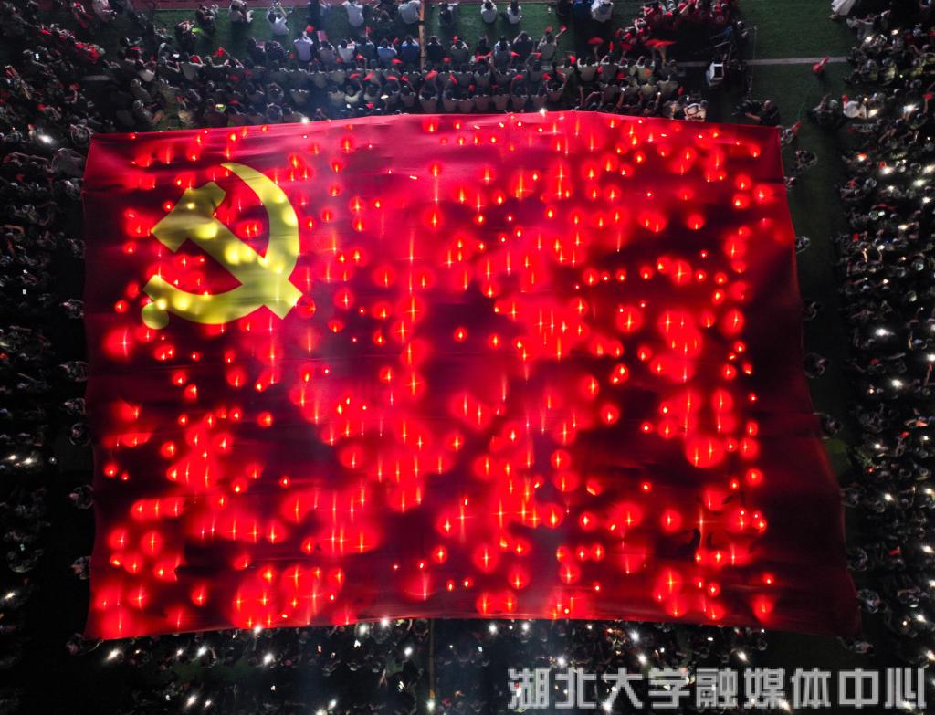 课程尾声,一面巨幅党旗在观众中传递,星星点点的手机灯光照亮党旗,“请党放心,强国有我”的铮铮誓言在现场回荡。